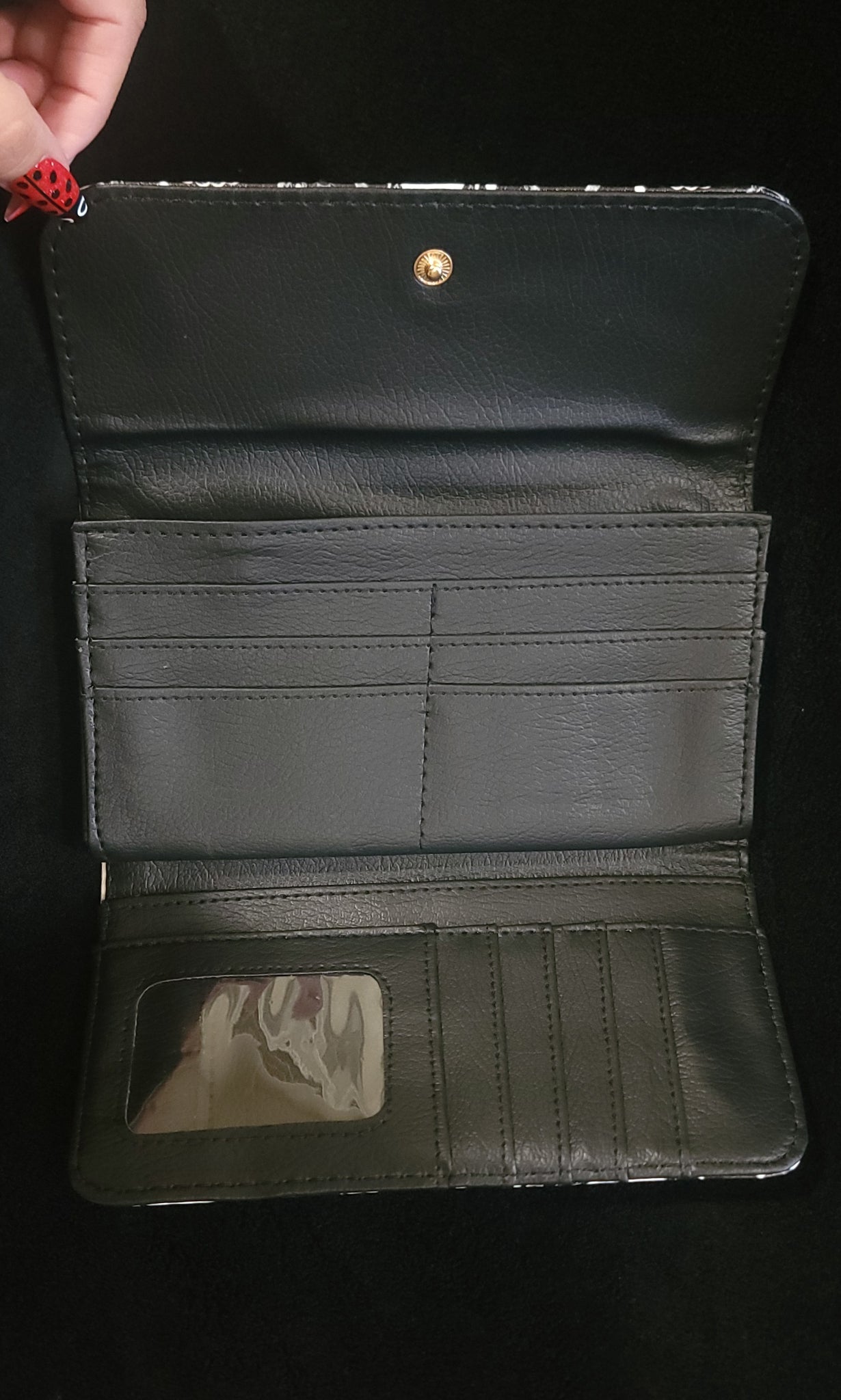 Made from a faux leather, this wallet measures 12.5 x 8 inches when fully open, has an ID window, cash slots, multiple card slots, and a zipper compartment.