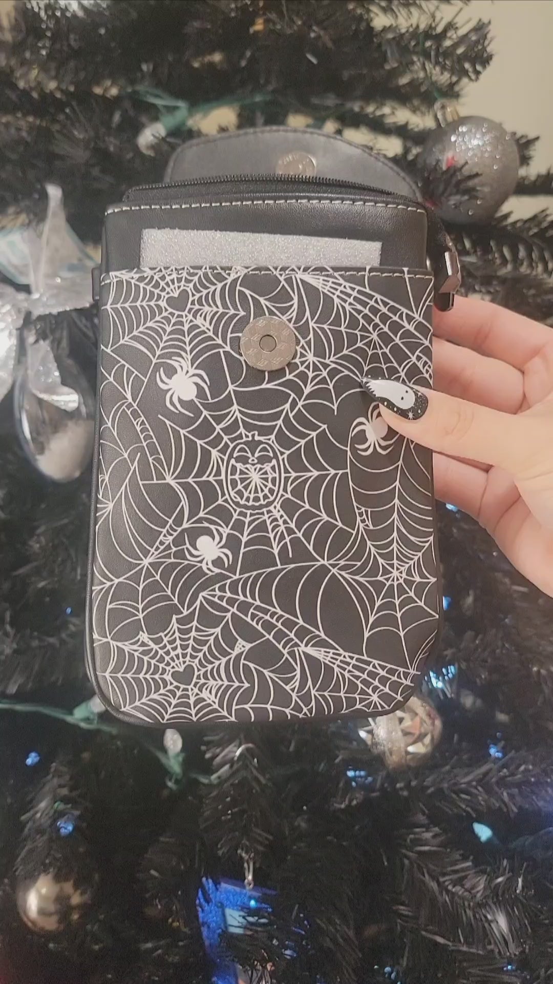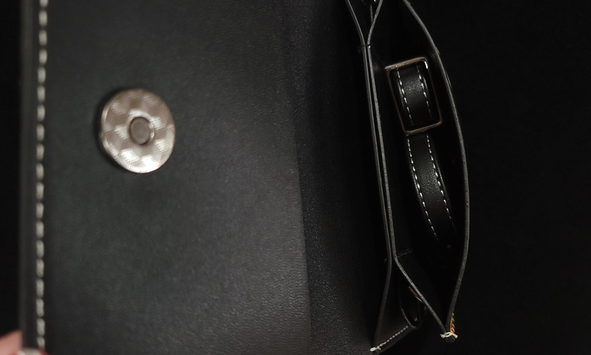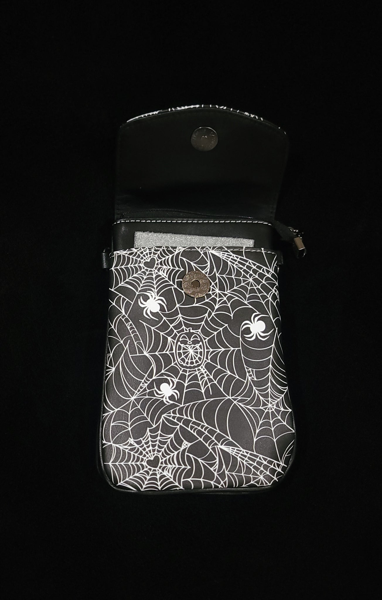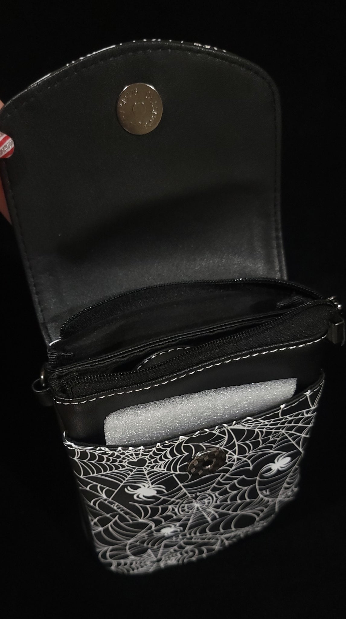 Made of a microfiber faux leather, this mini bag has a zipper slot, and card slots, with a 50in adjustable strap, and a magnetic closure. Measures 7.6 x 4.9 inches.