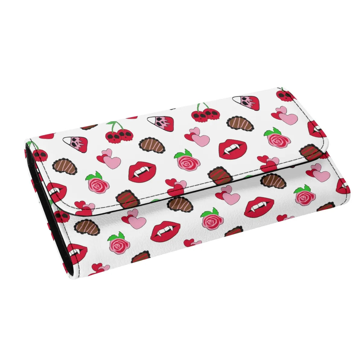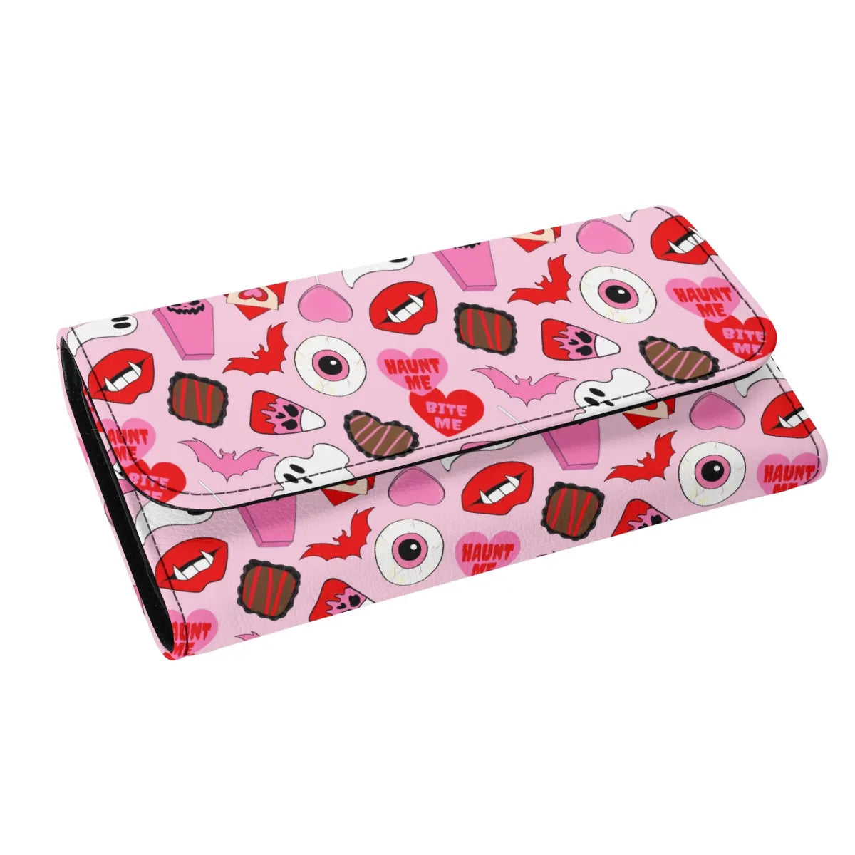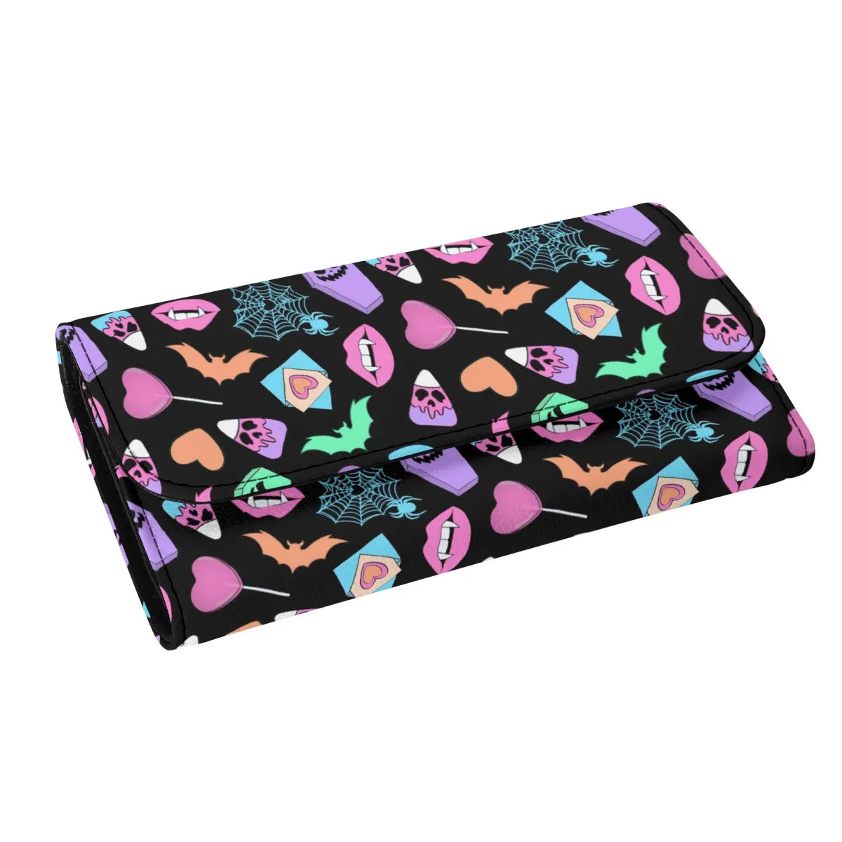 Made from a faux leather, this wallet measures 12.5 x 8 inches when fully open, has an ID window, cash slots, multiple card slots, and a zipper compartment.