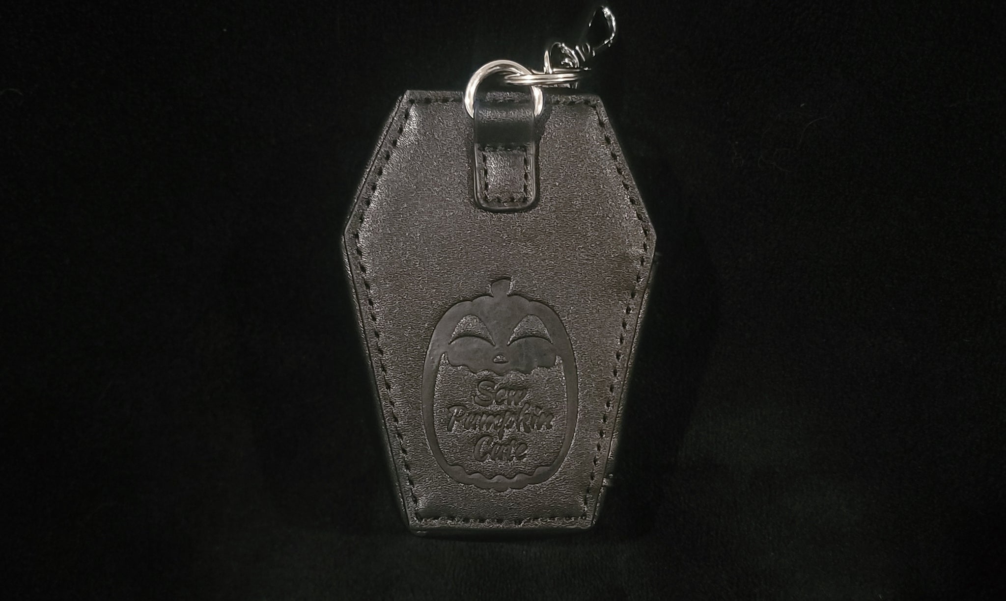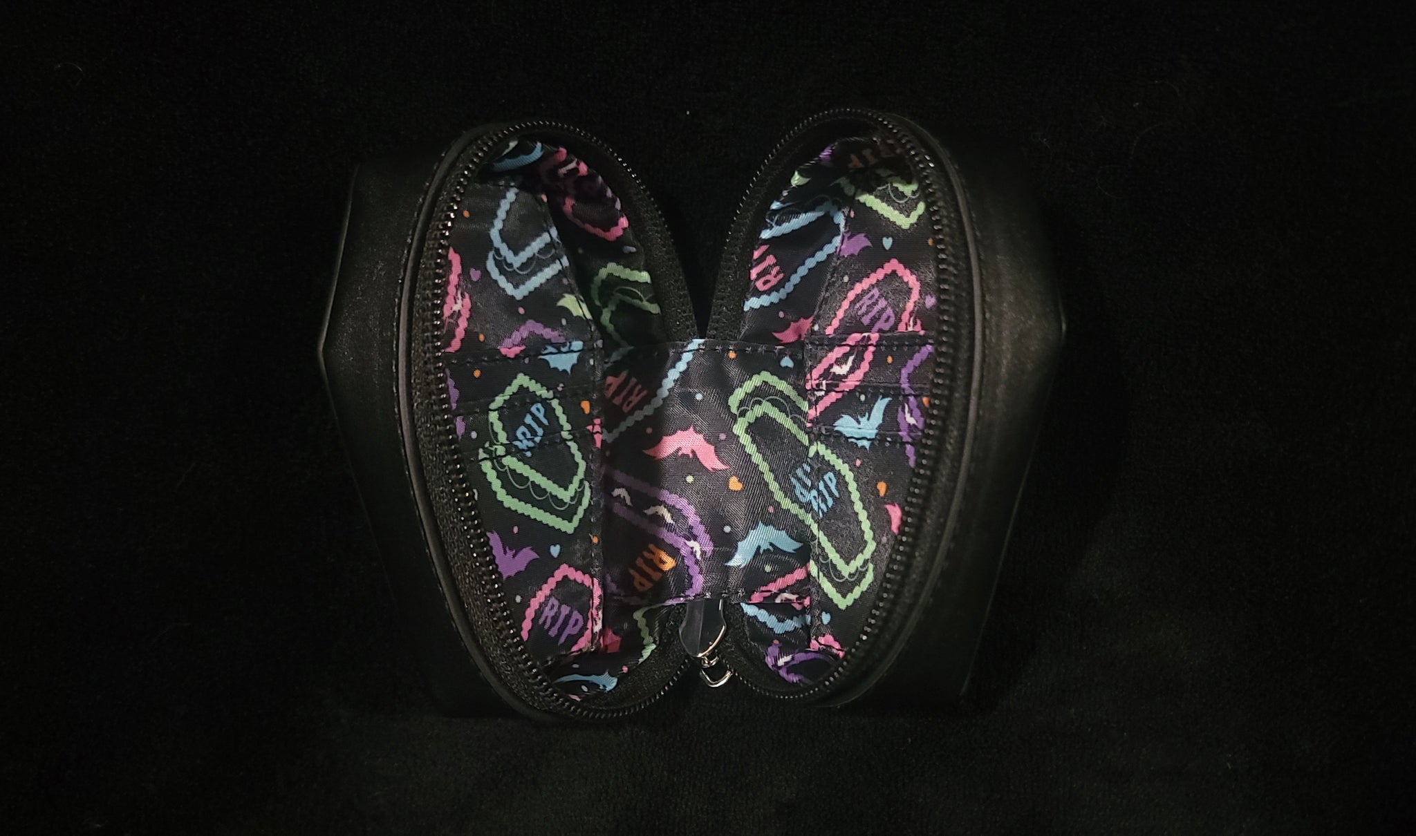 This mini keychain bag measures 3.5x3x2 inches, has silver hardware, a spooky cute lining, and is embroidered with webs!
